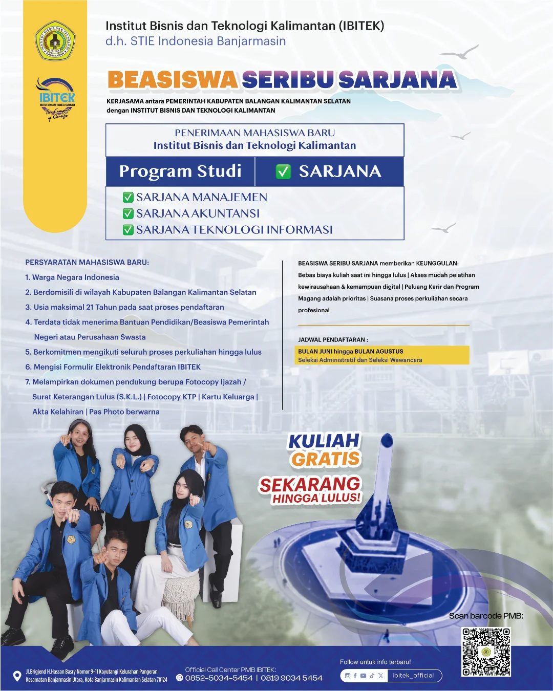 Institut Bisnis dan Teknologi Kalimantan (IBITEK). Alamat: Jl. Brigjend H. Hasan Basri No.9, RW.11, Pangeran, Kec. Banjarmasin Utara, Kota Banjarmasin, Kalimantan Selatan 70124. Telepon: 085250345454